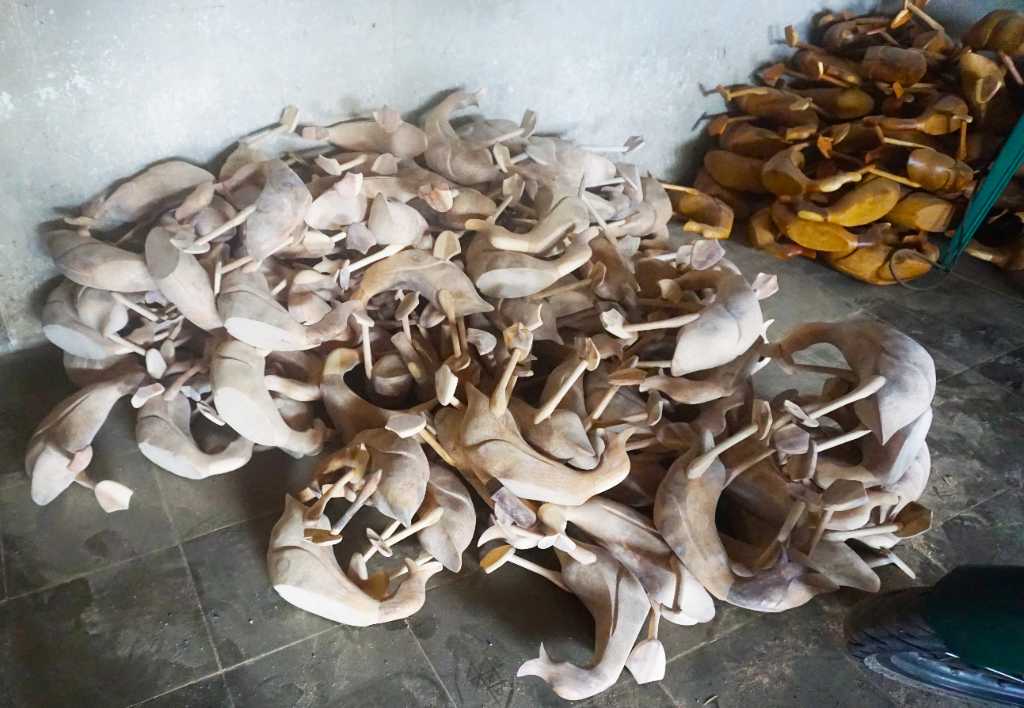 They are made from bamboo tree roots feet neck and head are made of teak hardwood