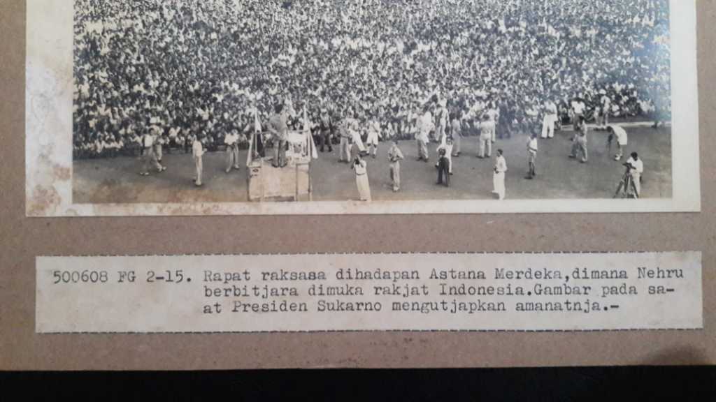 Rapat Raksasa dihadapan Astana Merdeka, dimana Nehru berbitjara dimuka rakjat Indonesia, Gambar pada saat Presiden Sukarno mengutjapkan amanatnya