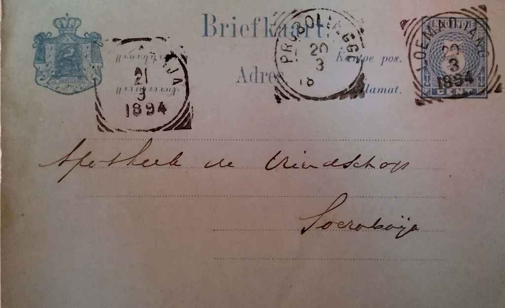 Kartoe Pos Briefkaart berbahasa Belanda; 20-3-1894 ; dari Loemajang tujuan Soerabaja
