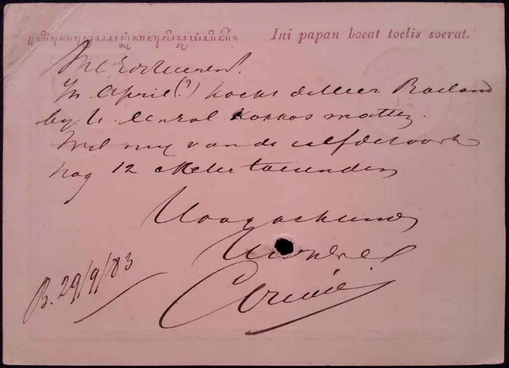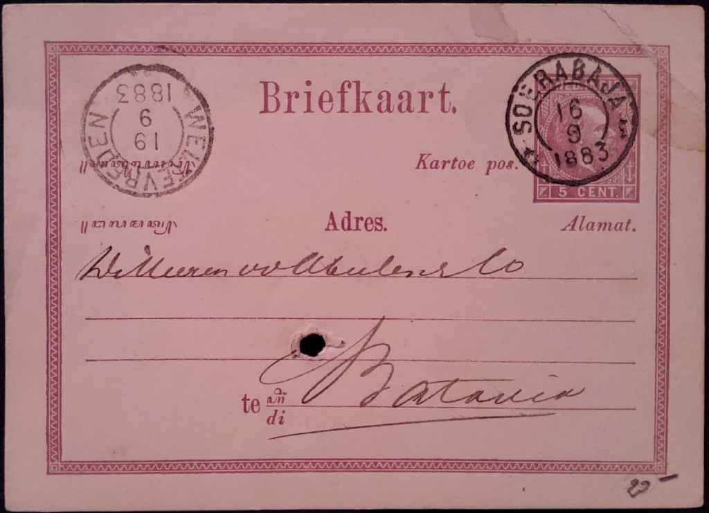 Kartoe Pos Briefkaart berbahasa Belanda; 29-9-1883 ; dari Weltevreden tujuan Batavia