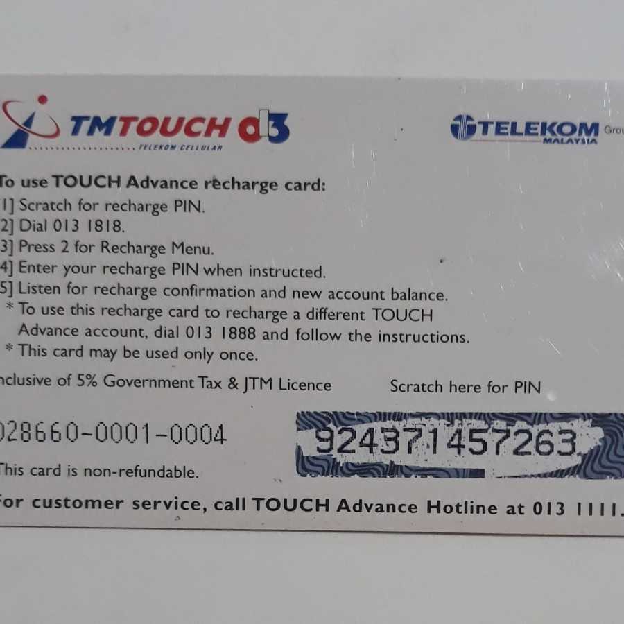 Gambar : Touch AdvanceKeluaran : Celcom MalaysiaNominal : RM50Kondisi : Used, mulus