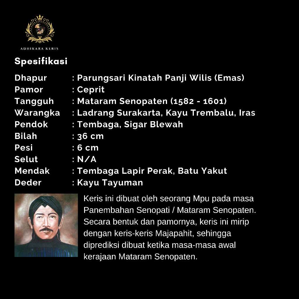 Keris ini dibuat oleh seorang Mpu pada masa Panembahan Senopati / Mataram Senopaten. Secara bentuk dan pamornya, keris ini mirip dengan keris-keris Majapahit, sehingga diprediksi dibuat ketika masa-masa awal kerajaan Mataram Senopaten.