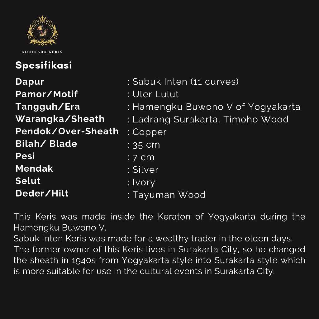 Keris ini dibuat pada masa Pemerintahan Sultan Hamengku Buwono V. Era tersebut merupakan masa keemasan keris Yogyakarta dimana suasana politik dan keamanan yang relatif kondusif dan memungkinkan mpu-mpu keris dapat berkembang pesat dalam kreasinya. Keris-keris pada masa ini memiliki ciri khas yang kuat, dengan hiasan yang lebih besar dan lebih tebal, serta pamor yang inovatif