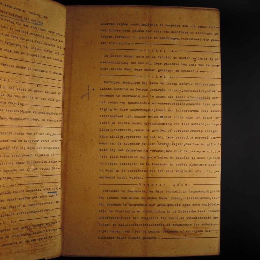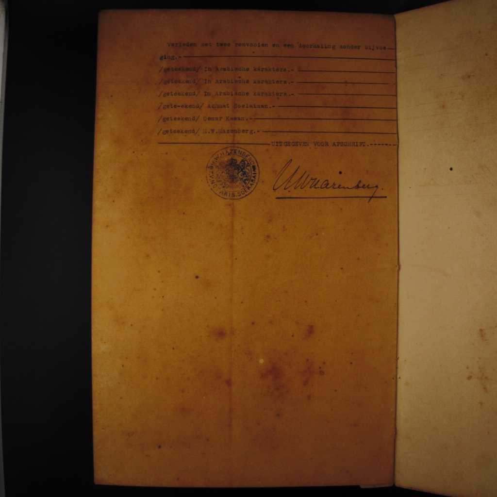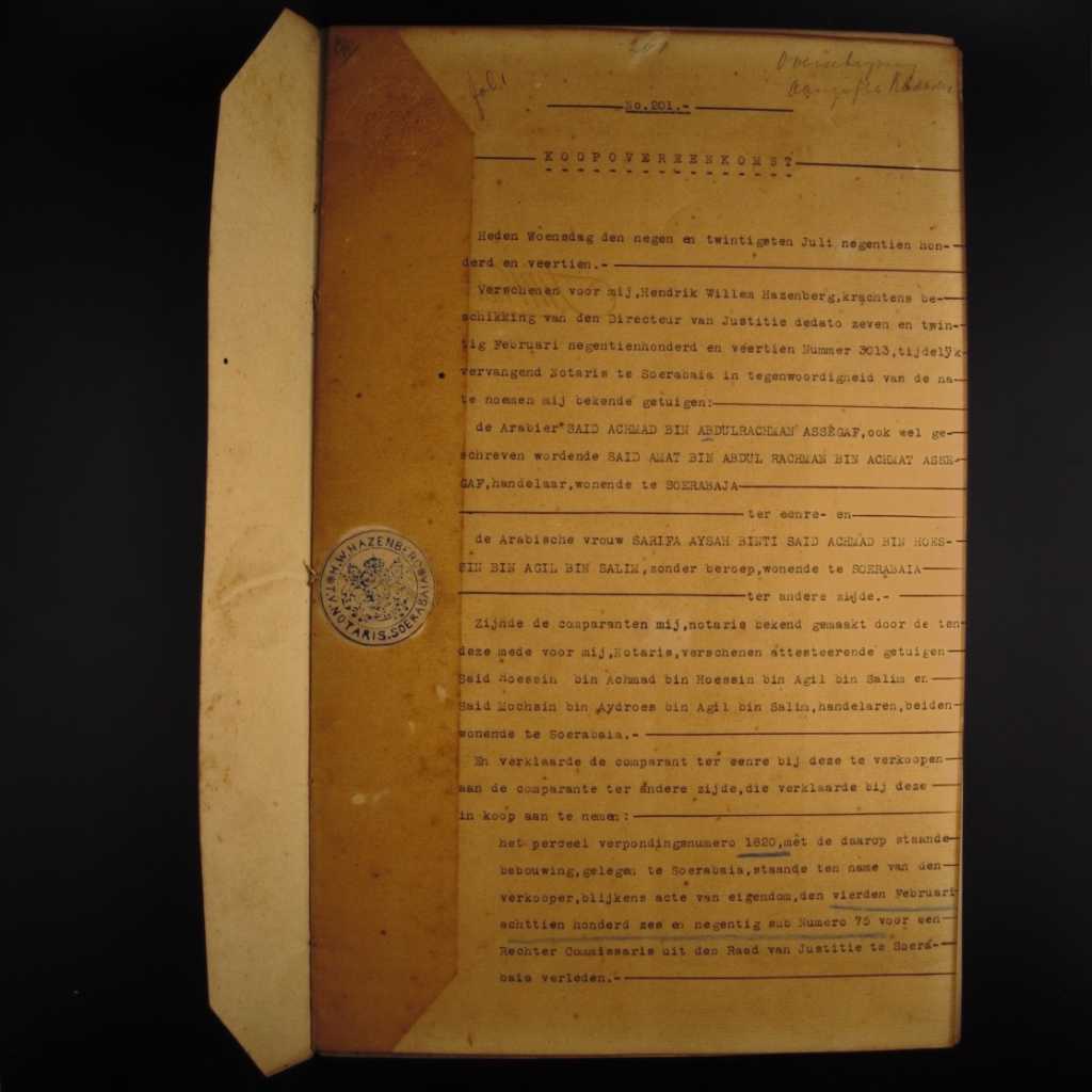 Pada hari ini tanggal dua puluh sembilan bulan Juli seribu sembilan ratus seratus empat belas, Saya Hendrik Willes Hazenberg, yang baru dinobatkan oleh Direktur Kehakiman untuk sementara waktu menjadi Wakil Surabaya di hadapan para saksi yang saya kenal di bawah ini orang Arab" Said Ahmad Bin Abdurrahman As segaf meskipun dikenai sanksi Said Ahmad Bin Abdul Rahman Bin Ahmad Assegaf tinggal di Surabaya