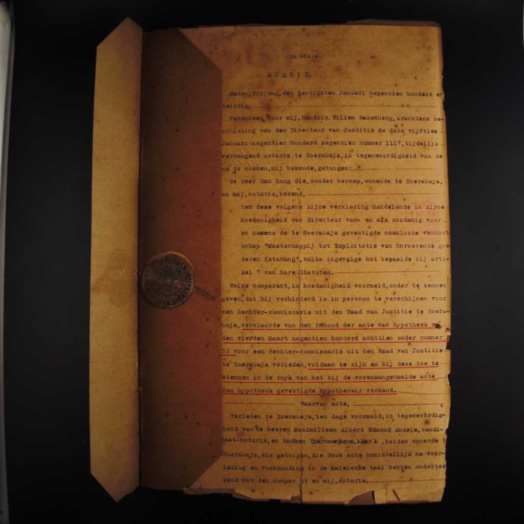 Menyatakan di hadapan saya, Hendrik Villem Hasenberg, berdasarkan perintah Direktur Kehakiman tanggal lima belas Januari seribu sembilan belas nomor 1117, menggantikan sementara Notaris di Surabaya, di hadapan saksi-saksi berikut ini, yang saya kenal: