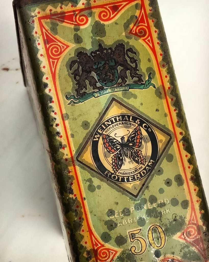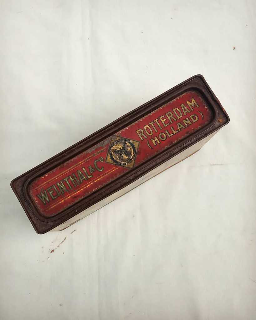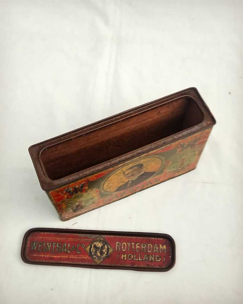 Bahan kaleng, dengan lapisan dalam kayu. Utuh, mulus.