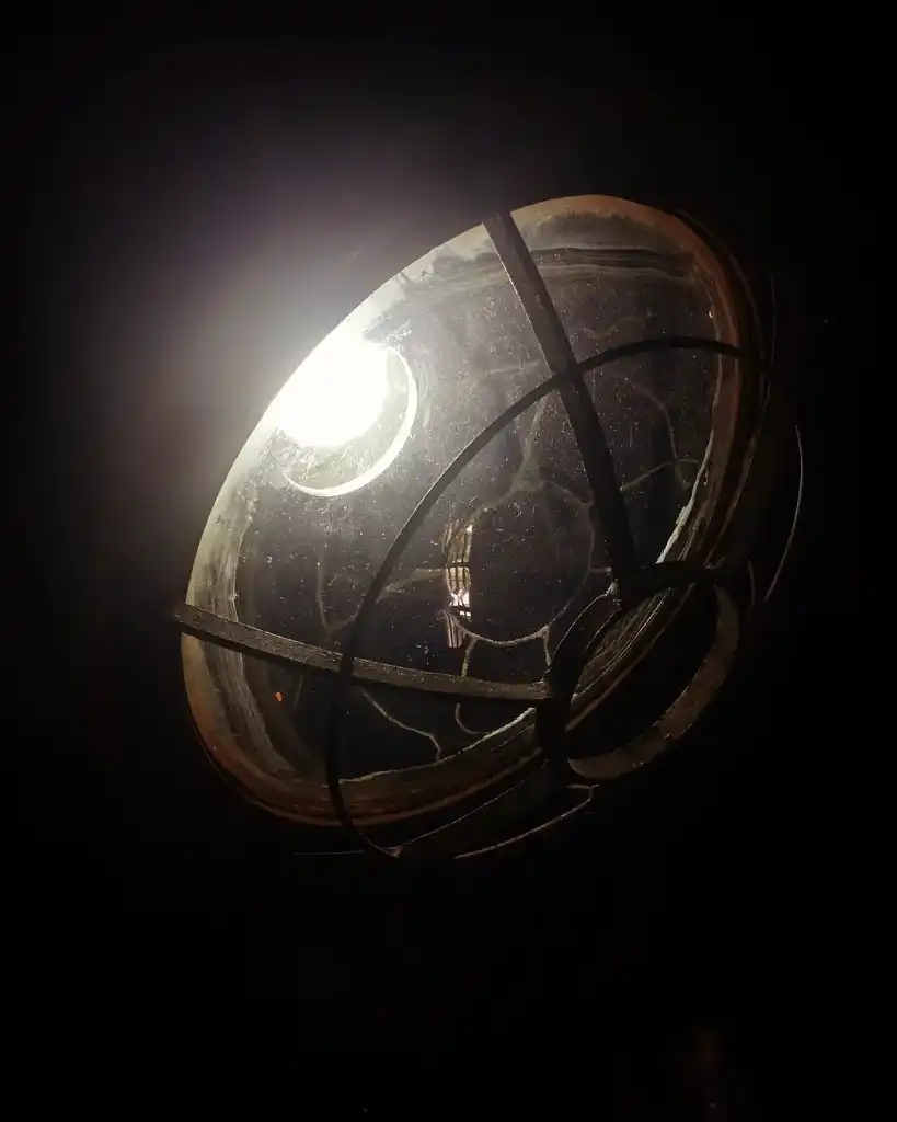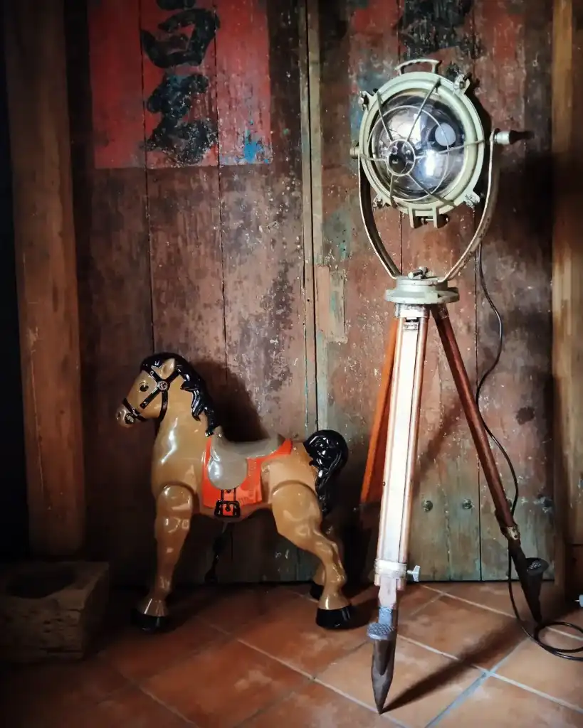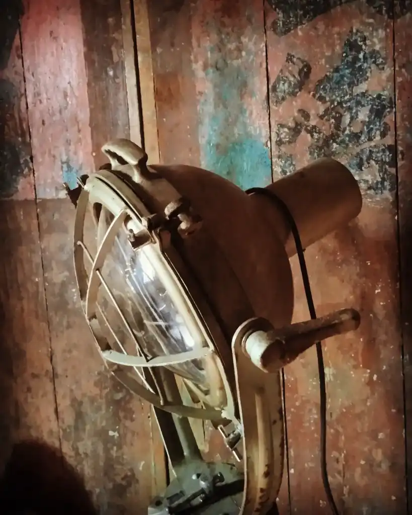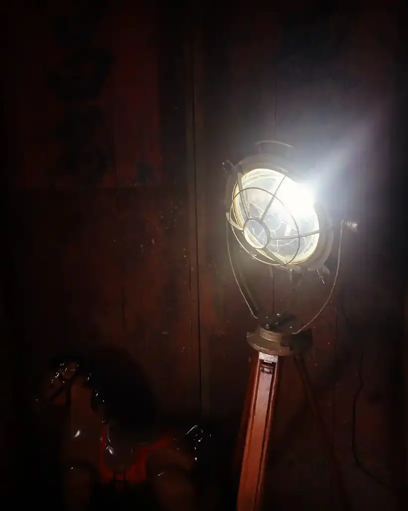 Material lampu ex lampu sorot kapal (made in Japan), Di padukan dengan tripod kayu ex theodolite lawas.