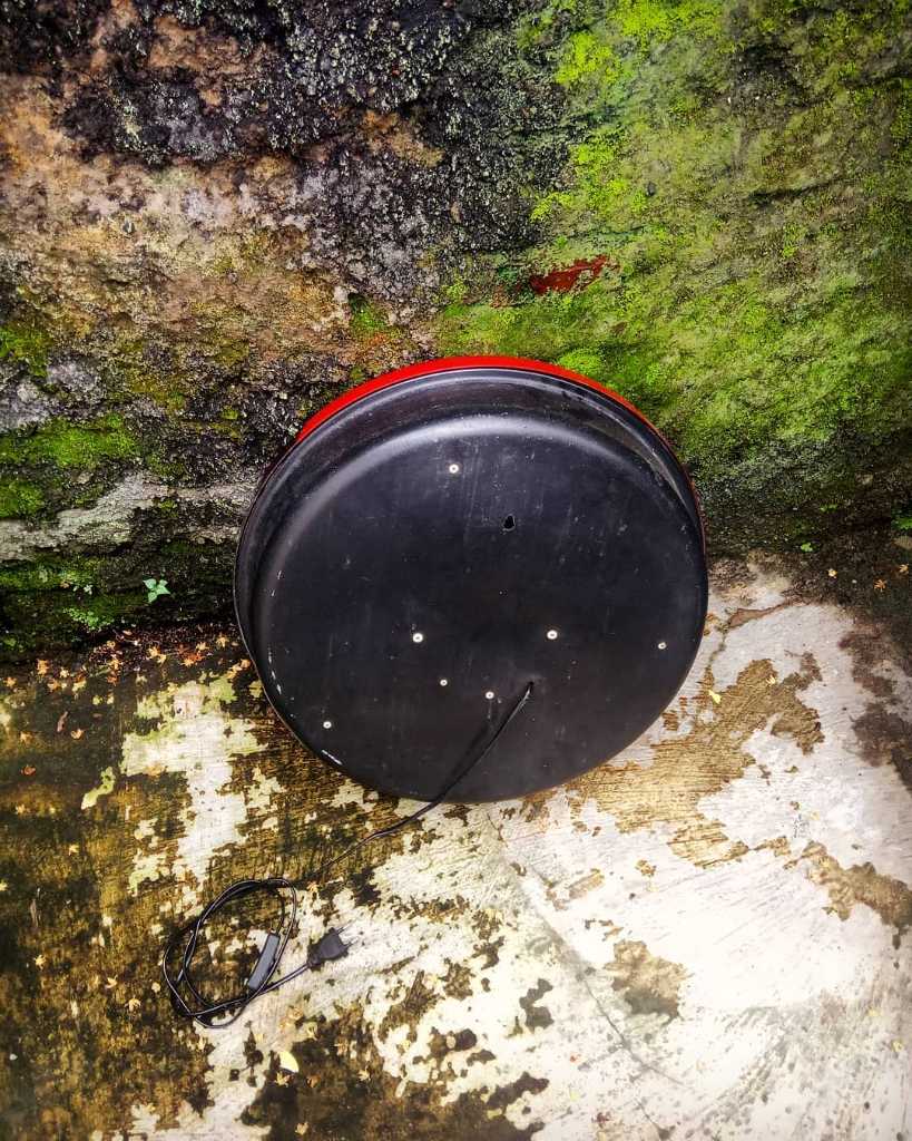Dimensi cukup besar, diameter 50 cm, cembung dengan tulisan dan gambar timbul.