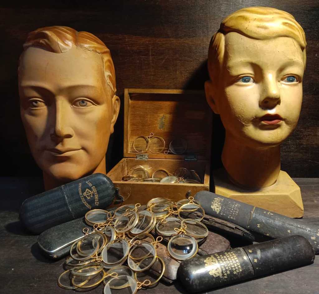 Ornament eks toko kacamata era tahun 30 an, manequin head, lensa tester tempat kacamata semua 8 jt