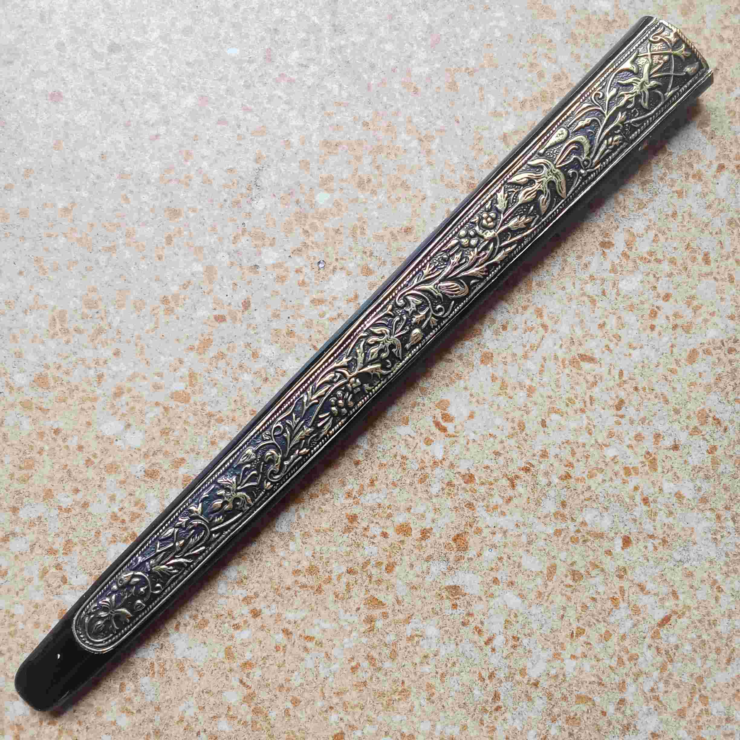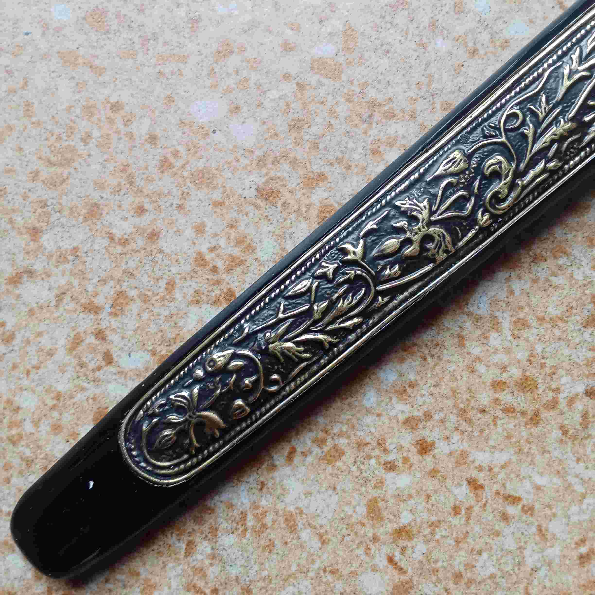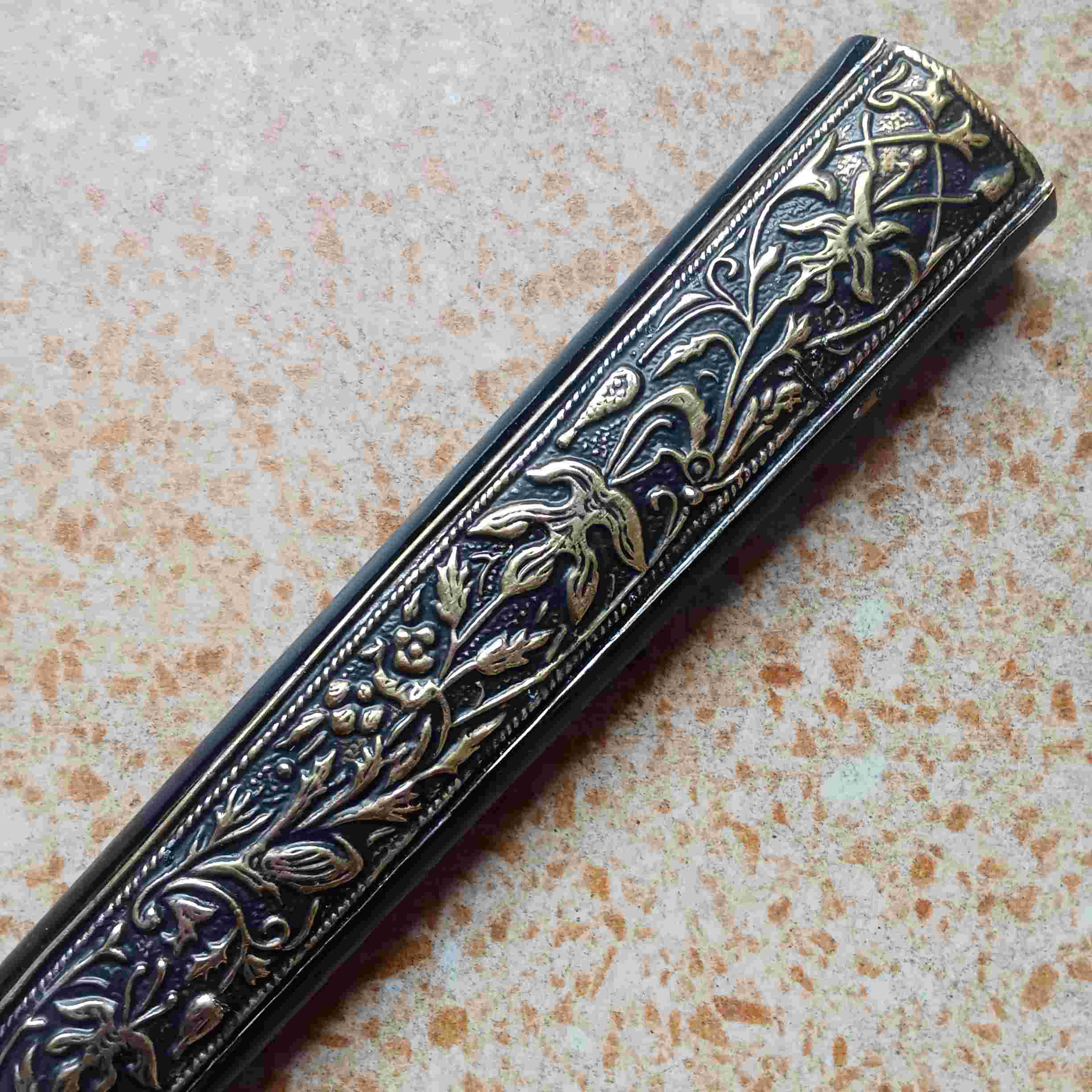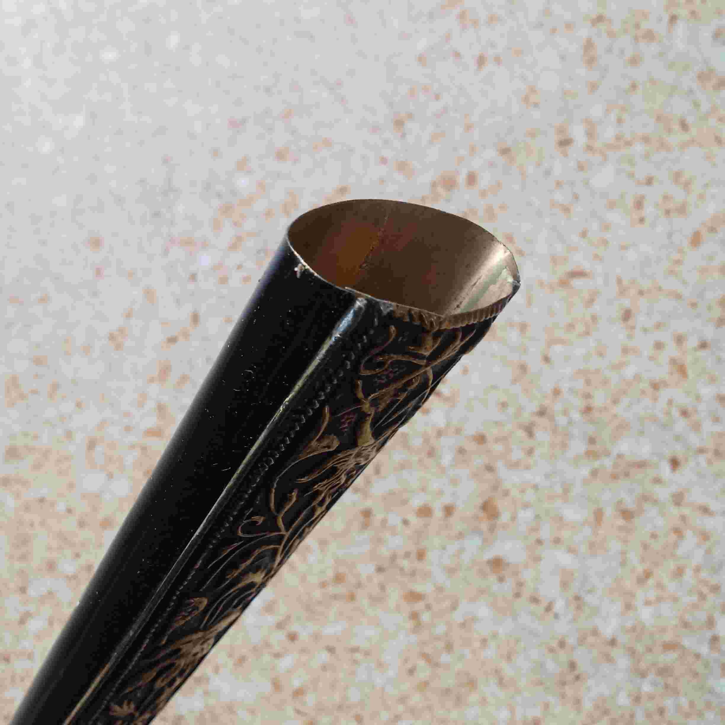 Pendok Slorok Kemalo Hitam Langgam Solo Ukiran Padi Dan Kapas Lambang Kemakmuran adalah produk yang dijual dengan bahan kuningan tebal sekitar ±0,4 lebih. Produk ini memiliki garap alusan sesuai pakem dan menggunakan langgam Solo. Panjang produk ini sekitar ±36 cm.