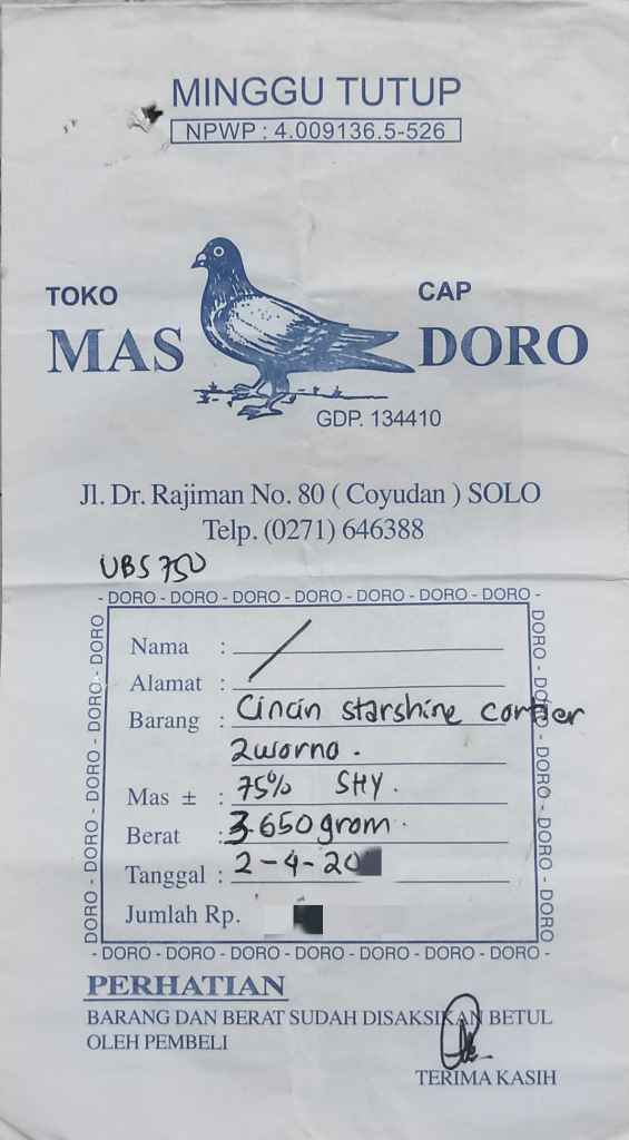 Setiap pembelian perhiasan di eDBe Jewelry akan mendapatkan nota asli dari toko emas penerbit/penjual pertama perhiasan ini (cek gallery foto). Nominal rupiah pada nota mungkin berbeda dengan harga tertera disini, tergantung harga pada saat listing produk ini.