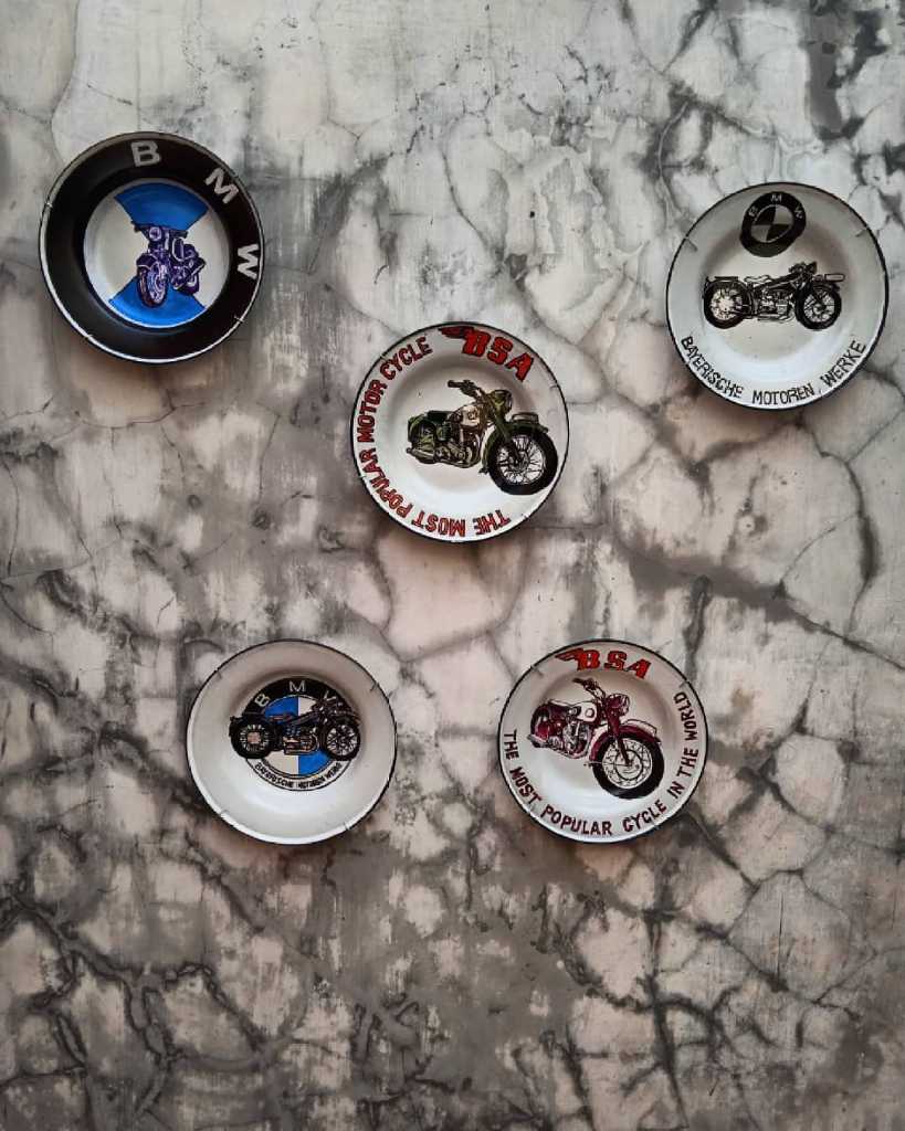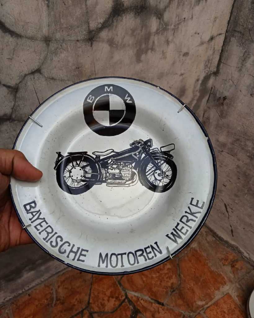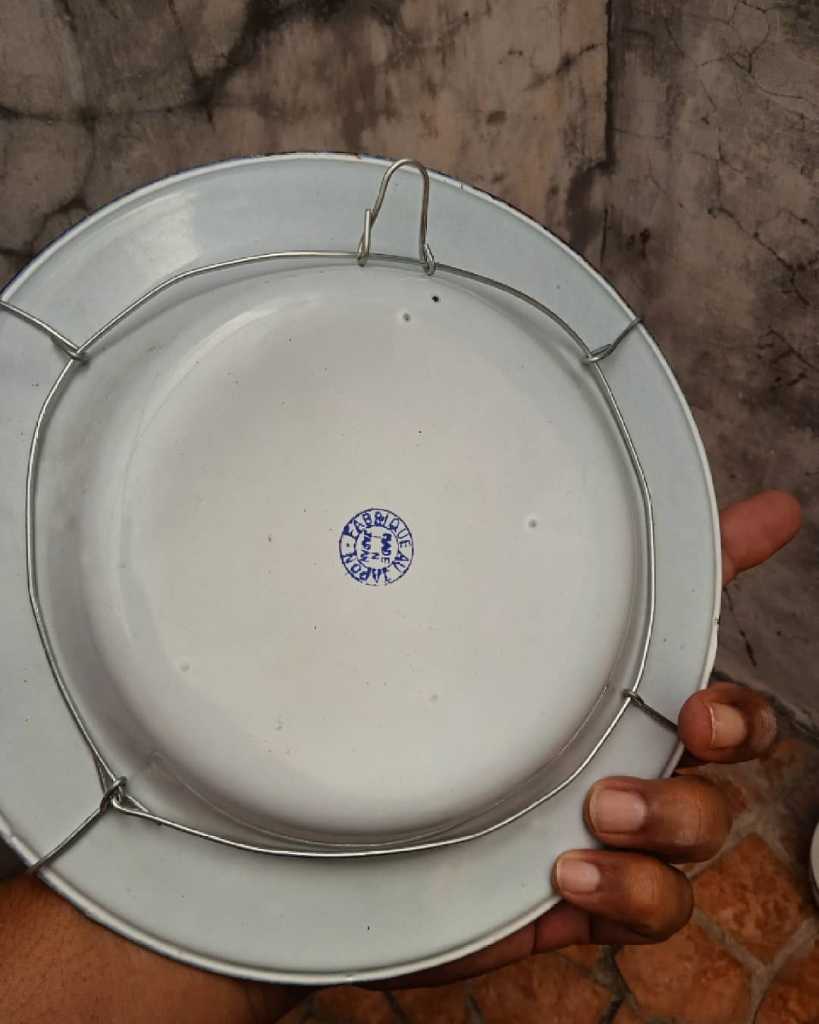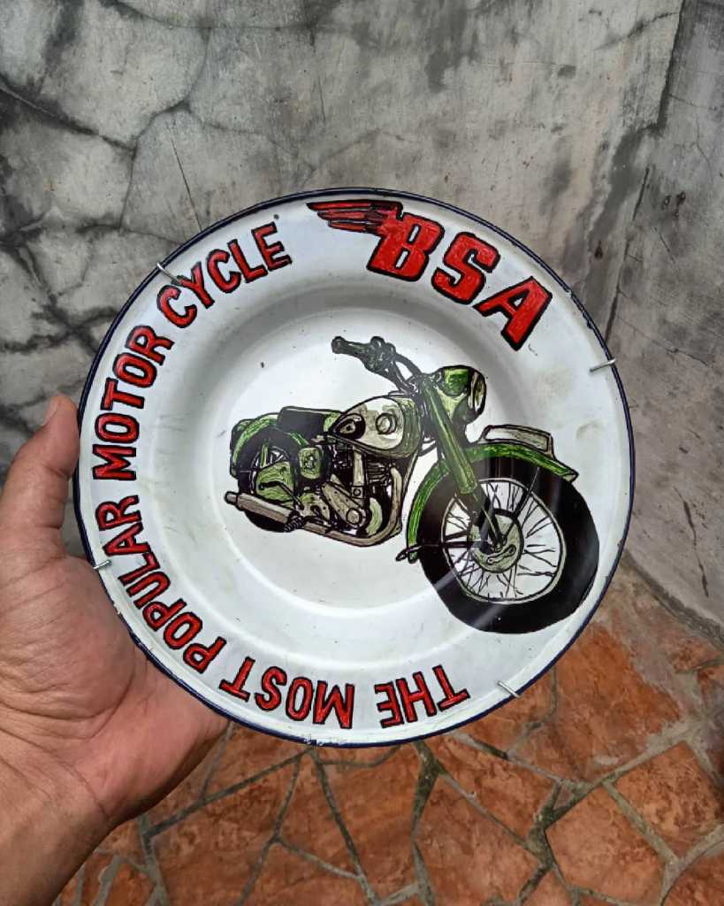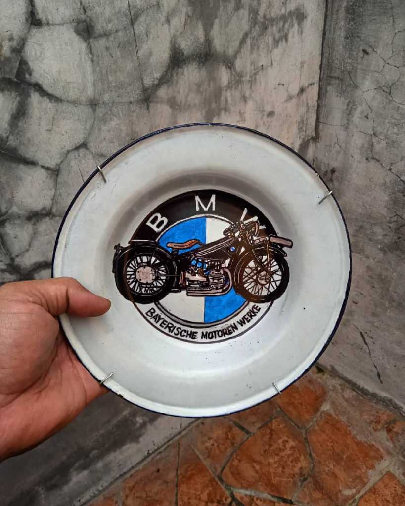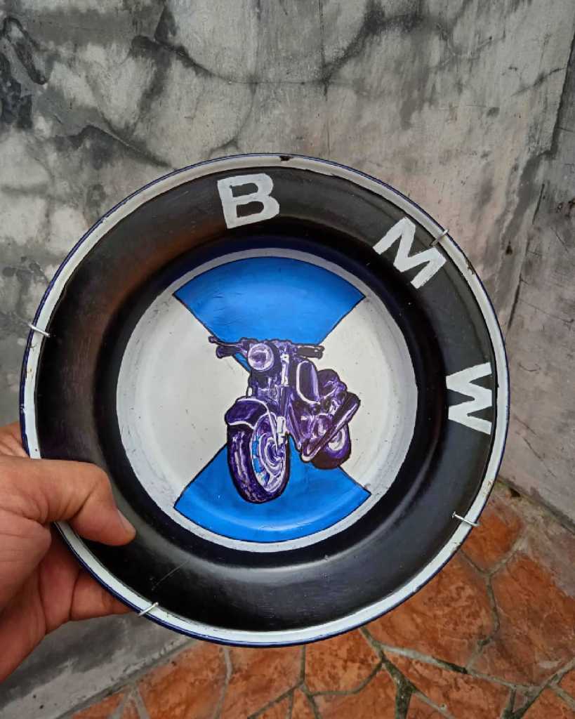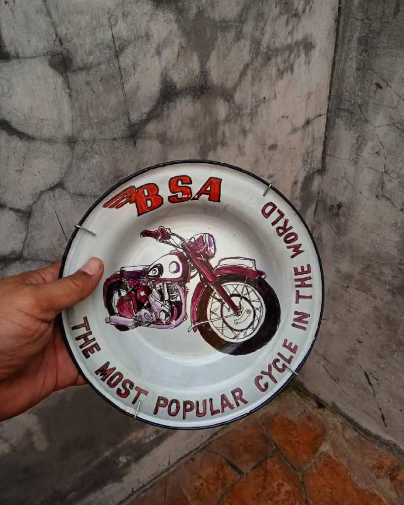 Bahan piring enamel yang di lukis oleh seniman lokal.
