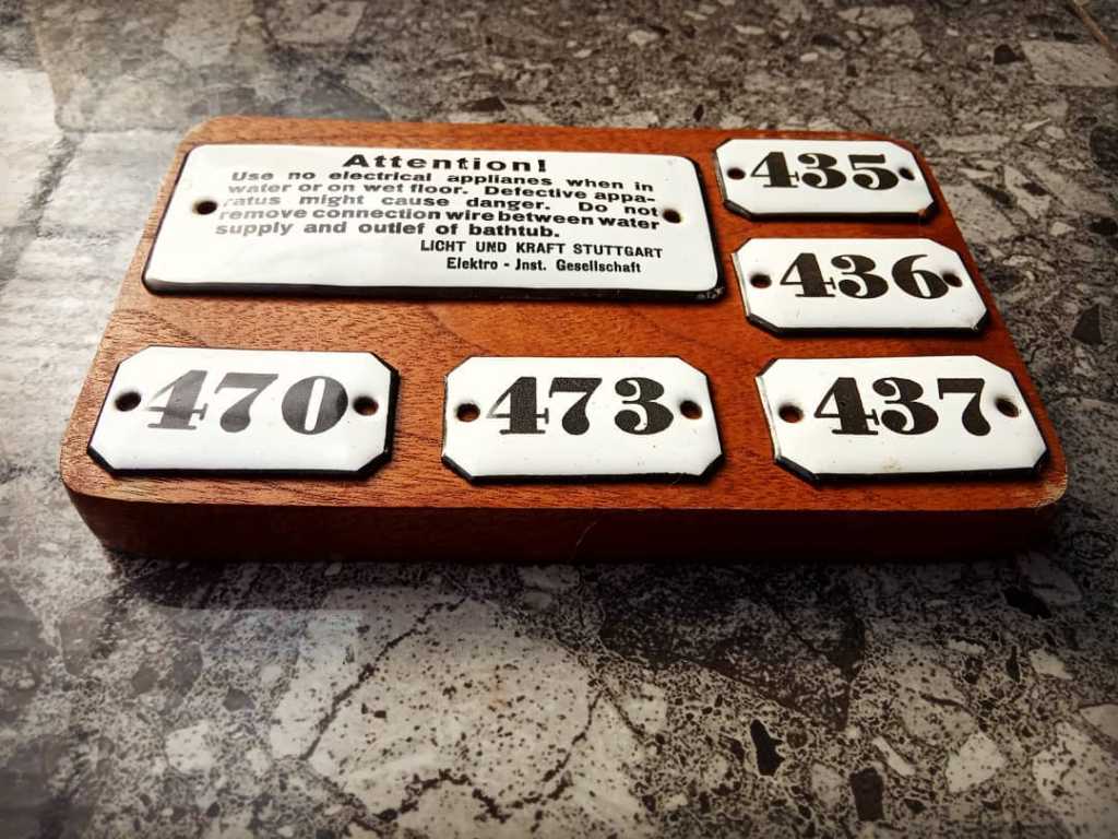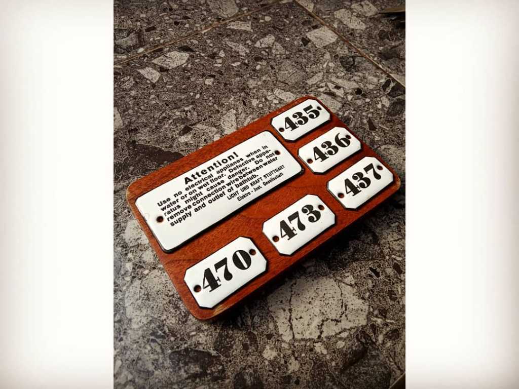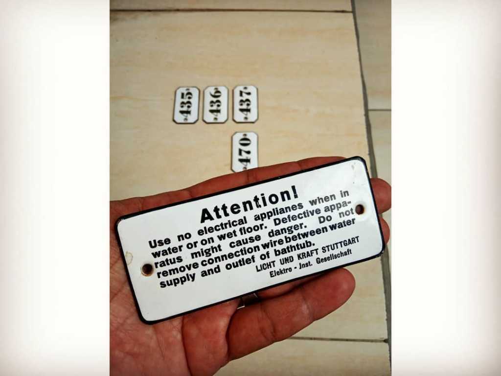 Peringatan listrik dulunya dipasang di kamar mandi, dan Plat nomor dipasang pada pintu-pintu kamar.