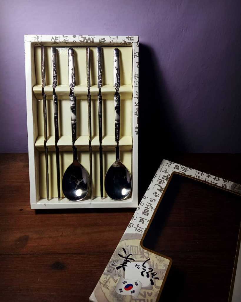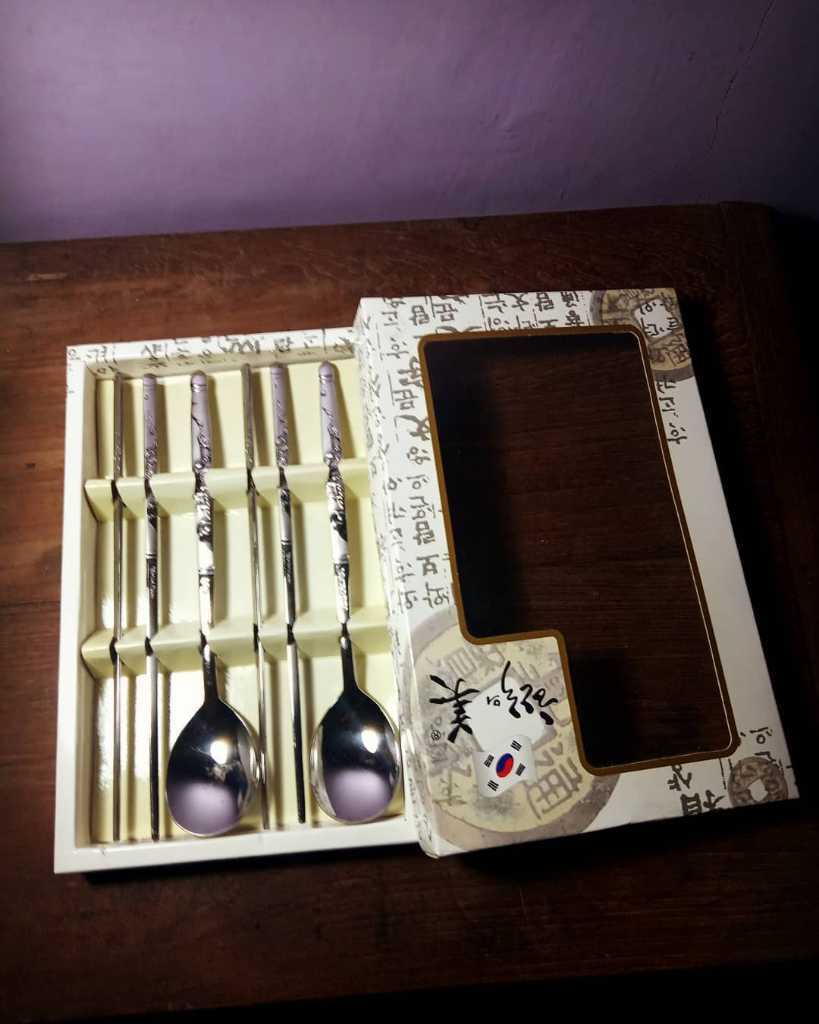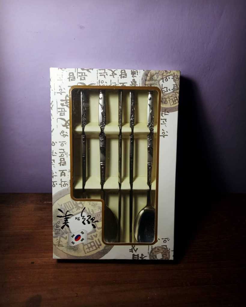 Souvenir "Korea", sendok & sumpit. Asli dari Korea.Bahan besi chrome.Bukan barang lawas, tapi layak koleksi.