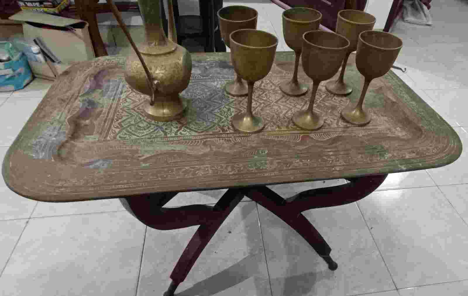 Nego untuk kolektor, bahan dari perunggu terdiri dari 1 teko, 6 gelas, 1 nampan dan kaki meja.. warisan keluarga.. Nampan panjang 74cm lebar 44cm tinggi kaki meja 37, teko tinggi 46cm, gelas 15cm diameter 7cm