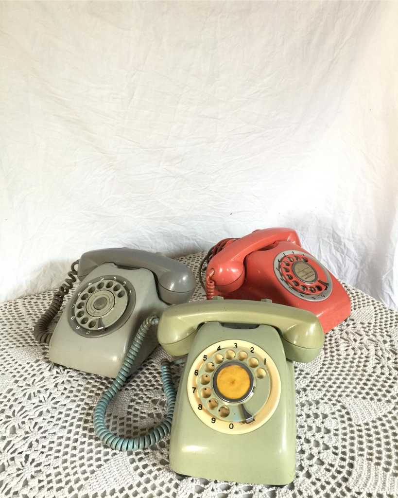 Telpon jadul tersedia dalam 3 warna (oranye, abu, dan hijau). ?