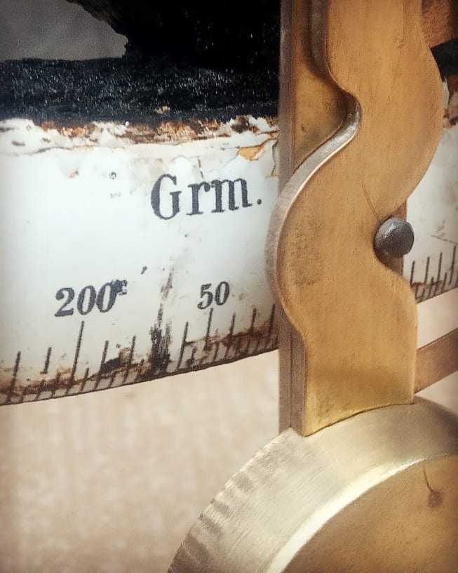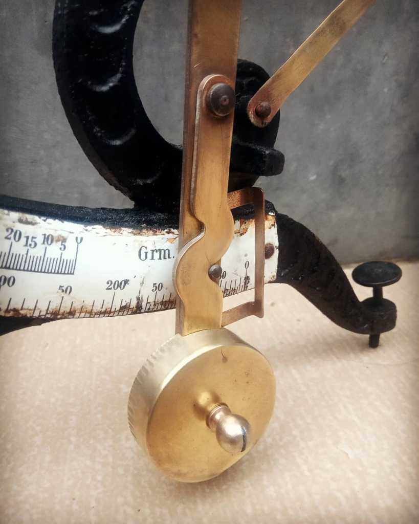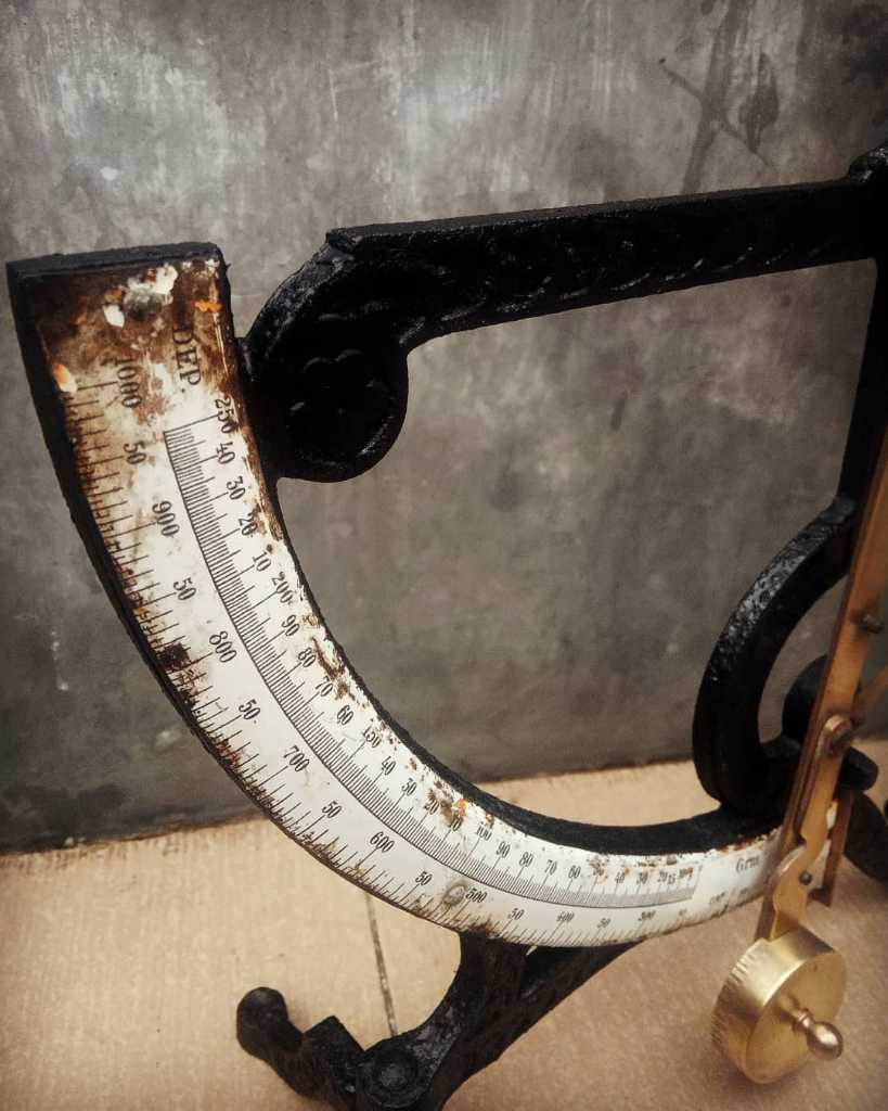 Tinggi 35cm, dengan kondisi yang masih sangat baik. Skala penunjuk berat dari Enamel, lainnya perpaduan besi Dan kuningan. Layak banget untuk di koleksi.
