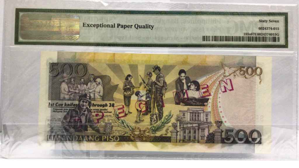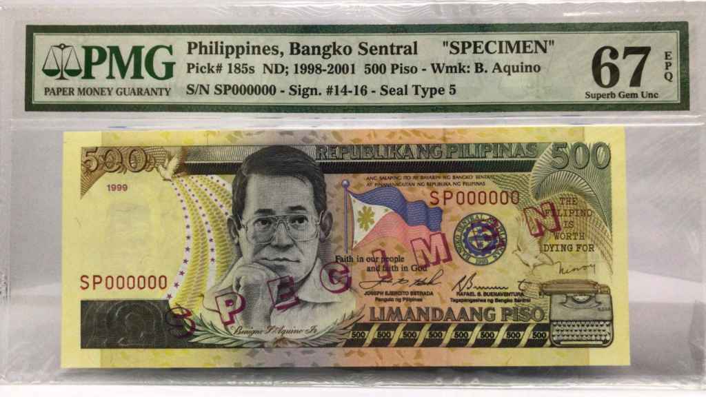 Nama barang : Uang Filipina 500 Piso Benigno Aquino Specimen PMG 67 Nomor Seri Cantik Urut 0
