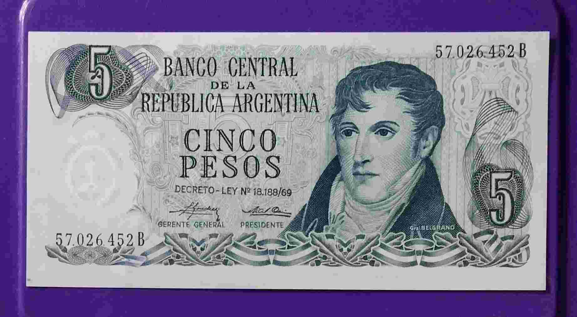 Uang Kertas Asing 5 Cinco Pesos Argentina Tahun 1969.h674