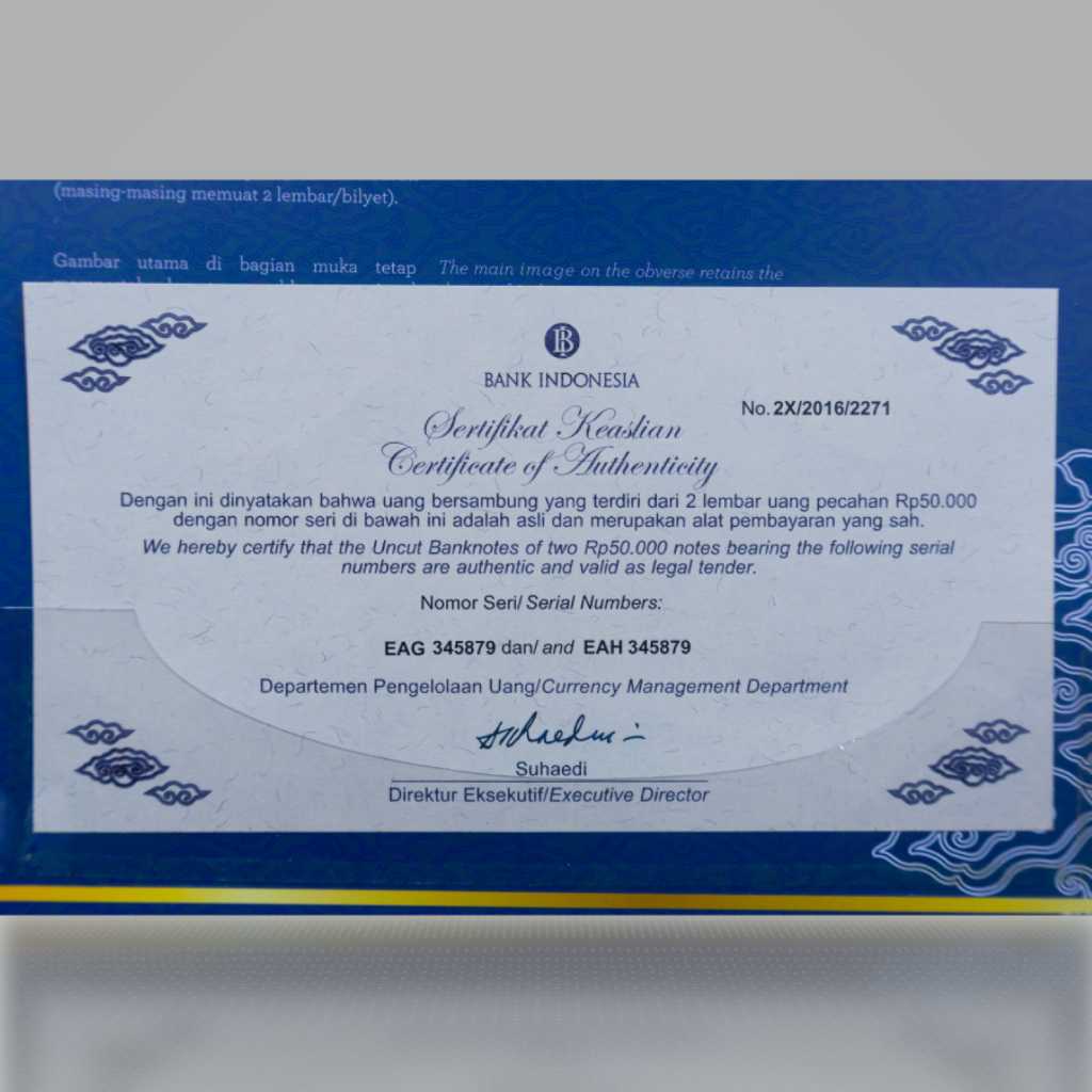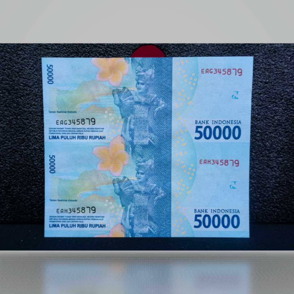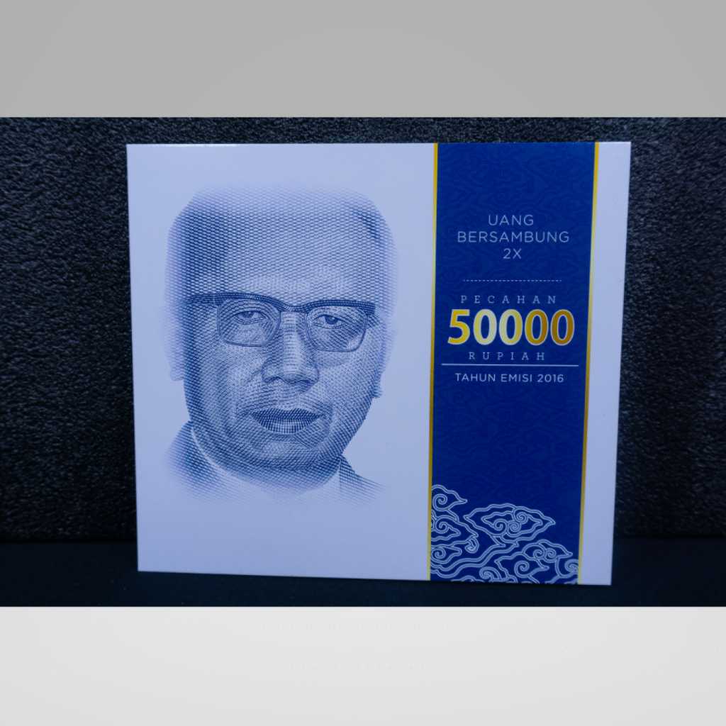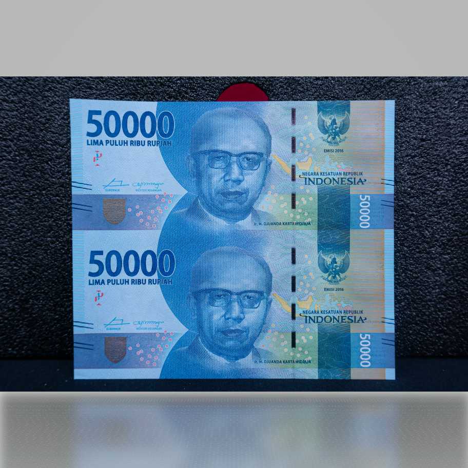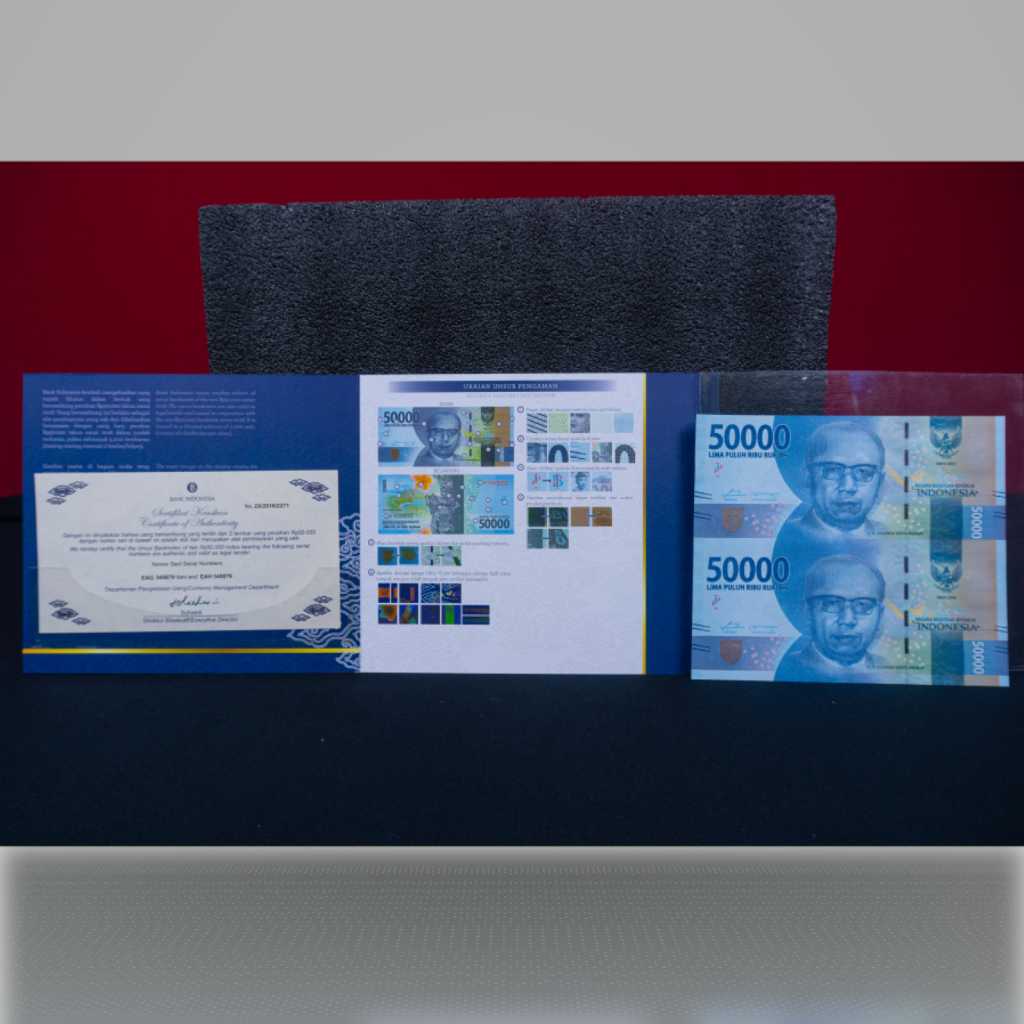 -Mata Uang___Rupiah -Bahan___Serat Kapas -Warna Depan___Biru -Warna Belakang___Biru -Tanda Air___Ir. H. Djuanda Kartawidjaja -Ukuran___146mmx130mm -Pecahan__Rp 50.000,00 Dua Lembar -Tahun Emisi___2022 -Tanggal Penerbitan___17 Agustus 2022 -Penanda Tangan___Gubernur Bank Indonesia dan Menteri Keuangan Republik Indonesia