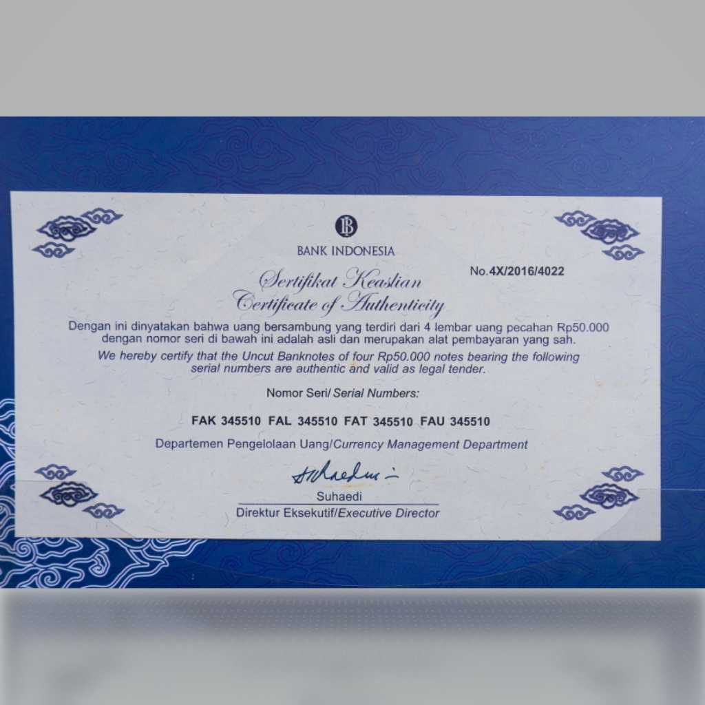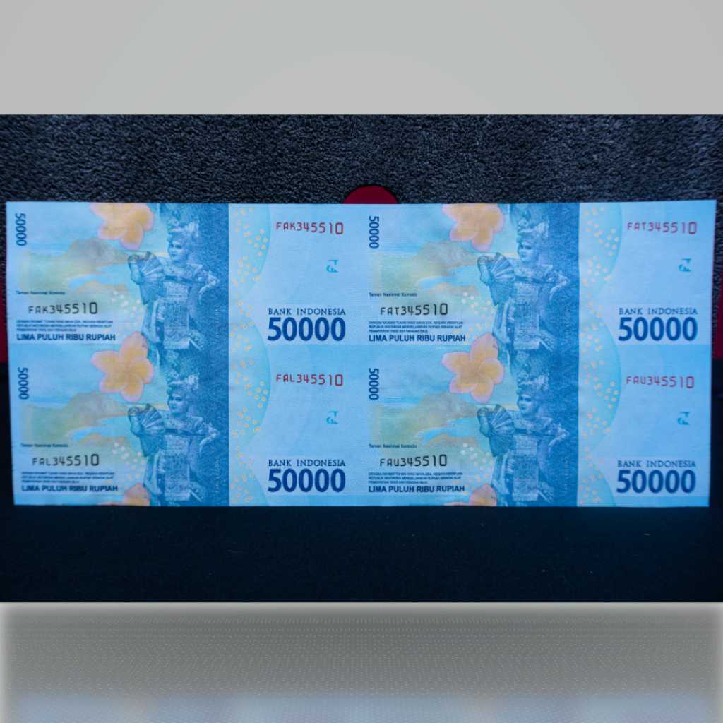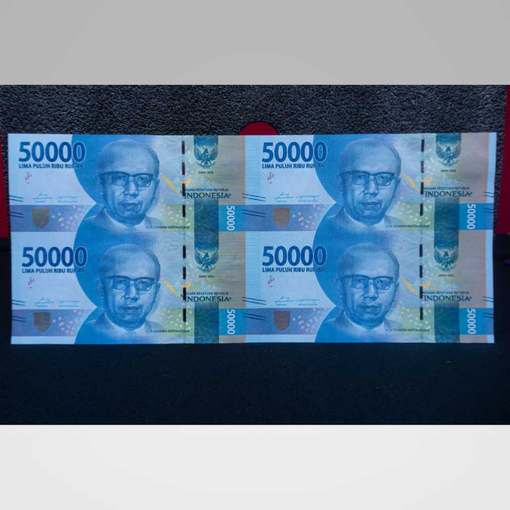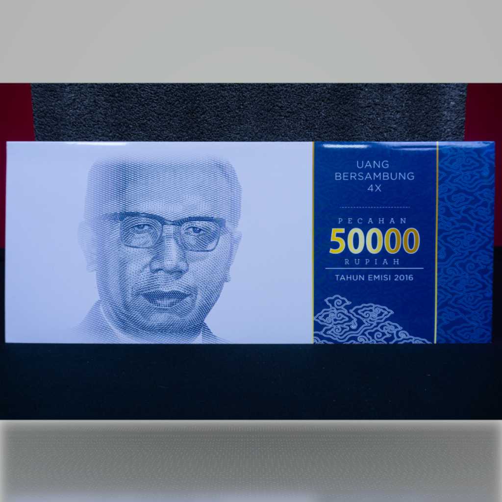 -Mata Uang___Rupiah -Bahan___Serat Kapas -Warna Depan___Biru -Warna Belakang___Biru -Tanda Air___Ir. H. Djuanda Kartawidjaja -Ukuran___292mmx130mm -Pecahan__Rp 50.000,00 Empat Lembar -Tahun Emisi___2022 -Tanggal Penerbitan___17 Agustus 2022 -Penanda Tangan___Gubernur Bank Indonesia dan Menteri Keuangan Republik Indonesia